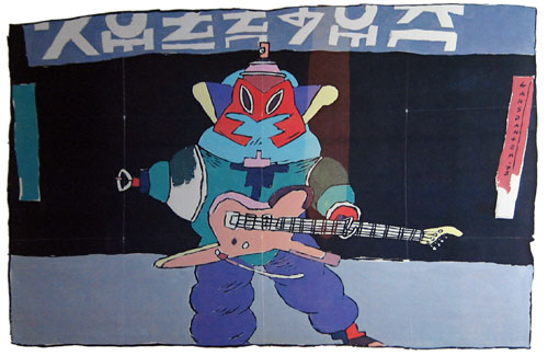 This is basically the coolest thing ever. I’ve been a big Gary Panter fan since my mom bought me Read Yourself Raw when I was way too young for it. In addition to his amazing comics, his work designing Pee-Wee’s Playhouse and his tons of record covers, he put out a few cool records of his own. In 1981, backed by the Residents, he released this single, Tornader to the Tater b/w Italian Sunglass Movie. The music is interesting, but what’s really cool is the sleeve folds out to a 28 X 20 inch poster. And this isn’t a rare record. I have 3 of them, bought at a few bucks each. Do you know how expensive a limited edition Gary Panter poster from 1981 would cost? I don’t, probably more than 2 dollars. 1 of my 3 copies is mounted in the living room. The other two are at the Secret Robot show.